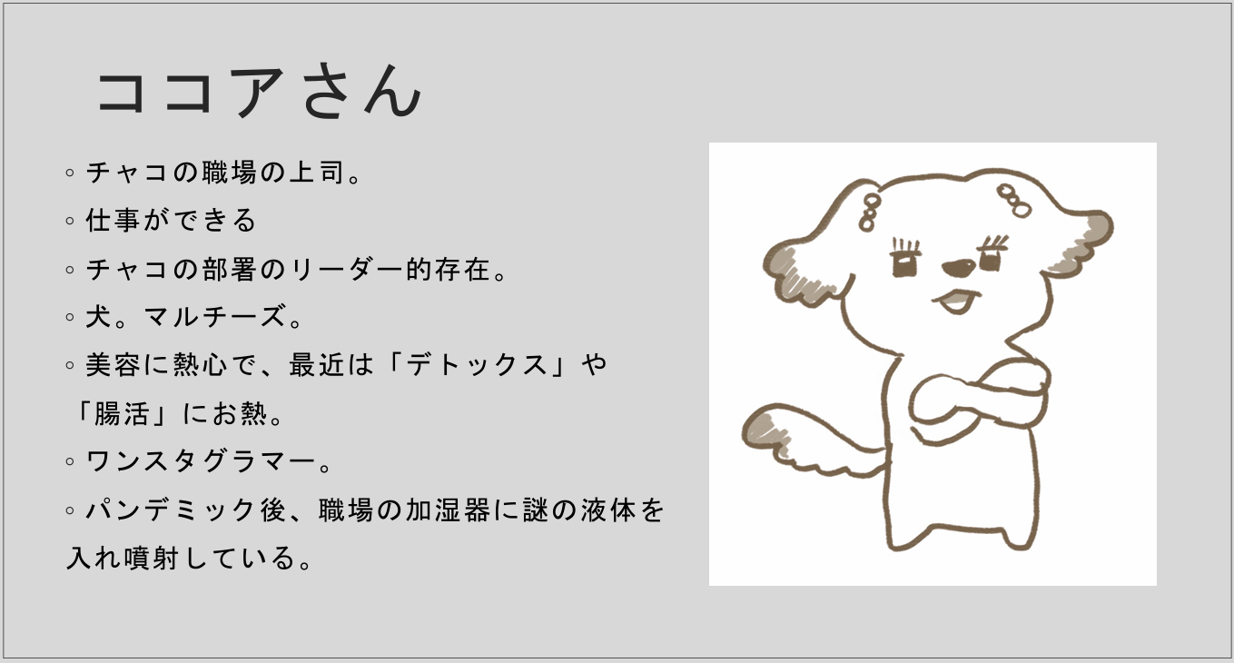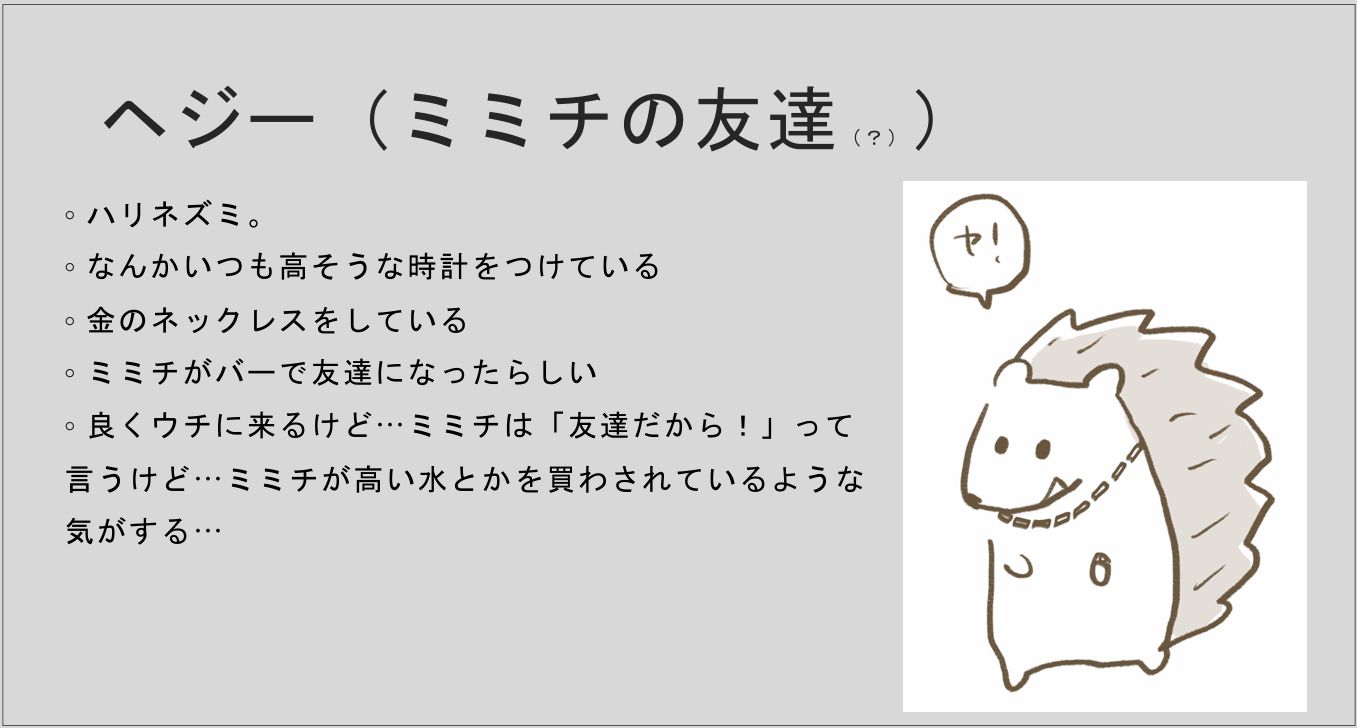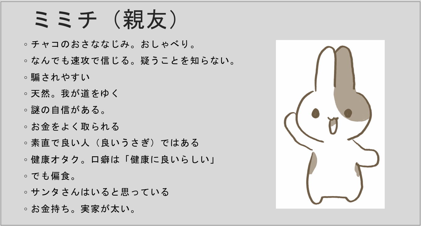 チャコの周りには、個性的な仲間がいっぱい。特に親友のミミチは、すぐになんでも信じてしまう危なっかしい性格。